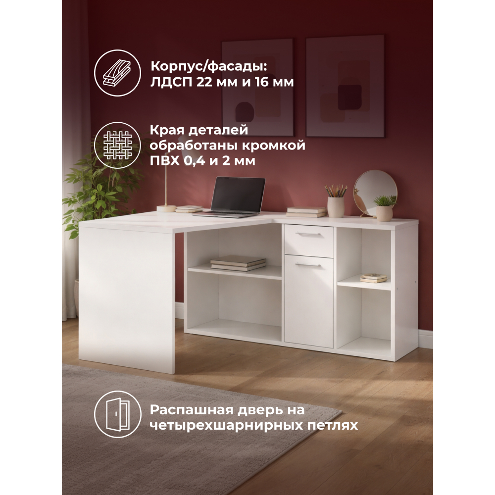 Стол Лайт 03.245F белый гладкий 101; ЛДСП. Толщина столешницы - 2,2см. Остальное - 1,6см. Имеется выдвижной ящик на шариковых направляющих. Имеется распашная дверь на четырёхшарнирных петлях