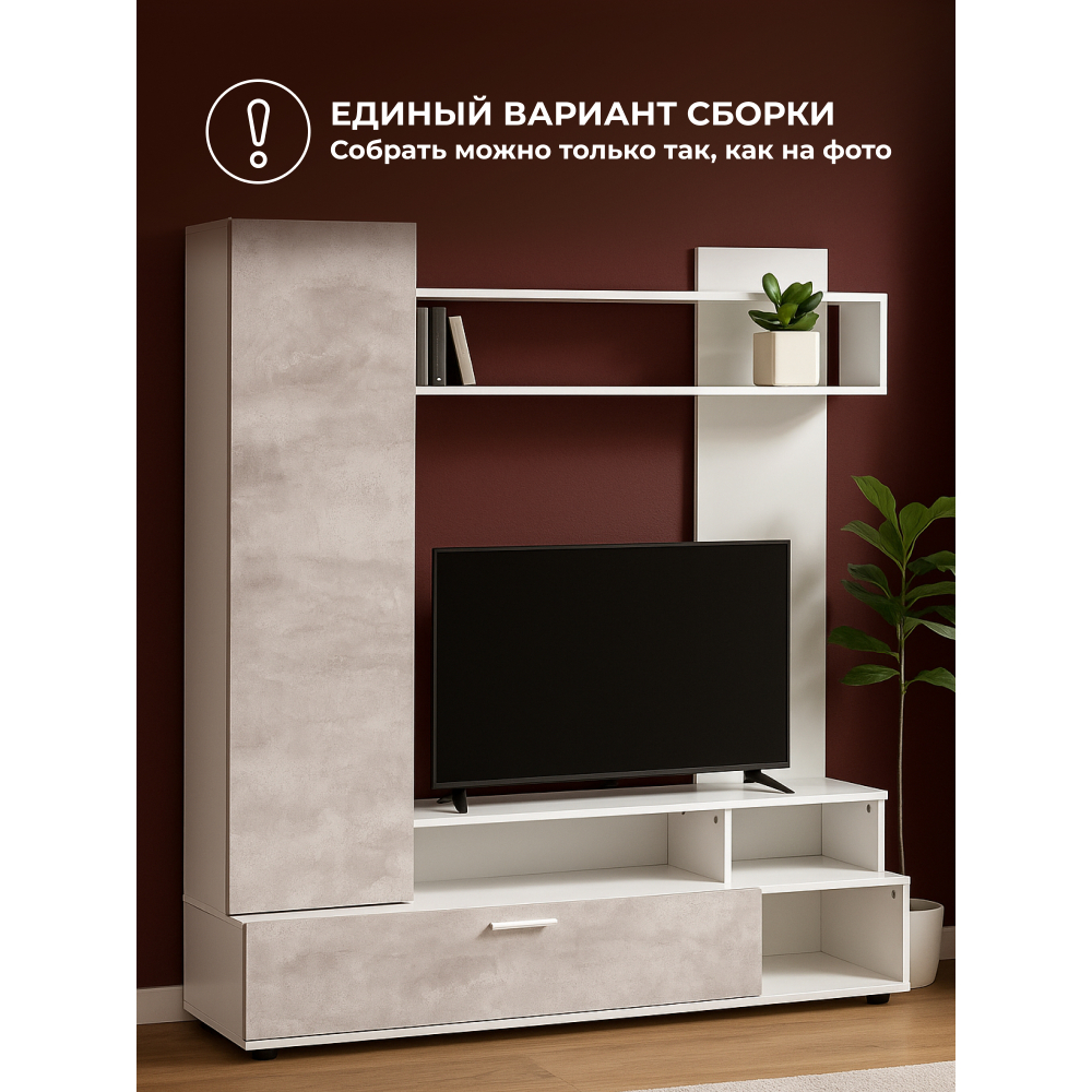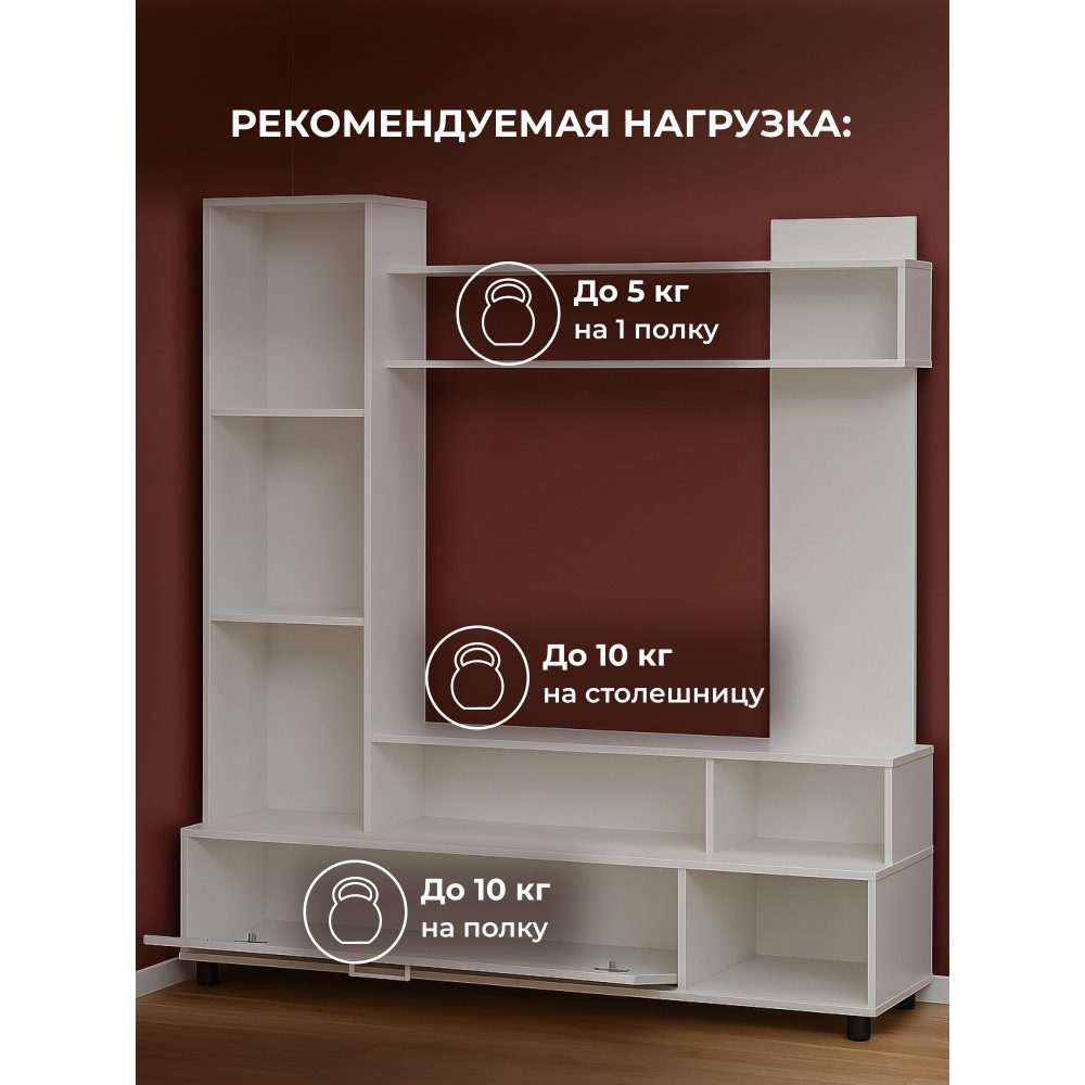 Изготовленная из ЛДСП, эта гостиная состоит из ниши под ТВ размером 111 * 72 см, которая позволяет разместить телевизор до 43 дюймов. Эта ниша является идеальным местом для просмотра ваших любимых фильмов и шоу.