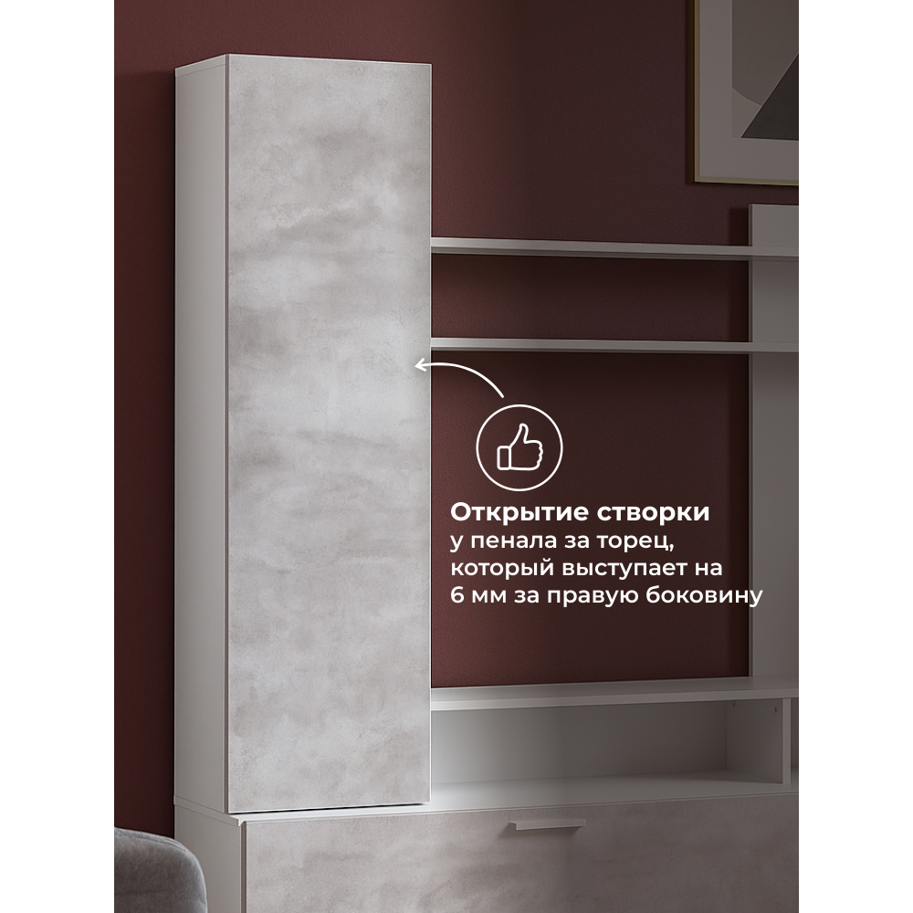 Слева от ниши расположен шкаф с 3 закрытыми полками, который предоставляет много места для хранения ваших вещей. Над нишей разместилась длинная полка, которая может стать идеальным местом для хранения книг, фоторамок и других декоративных элементов.