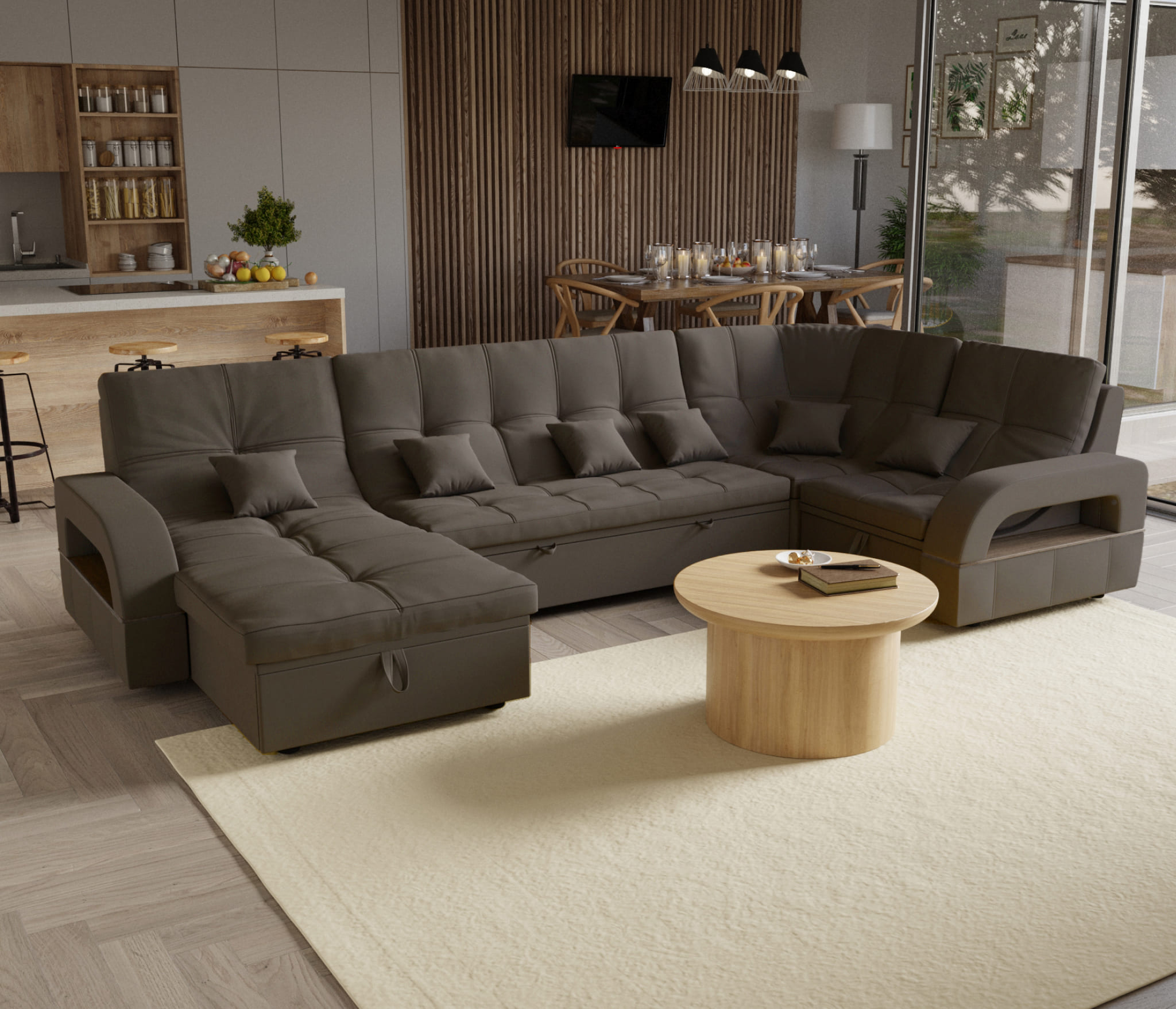 Подушки 6шт в комплекте. В чужих отзывах читала, что сзади ткань другая, но в нашем диване везде ткань одинаковая- его можно поставить посередине комнаты.