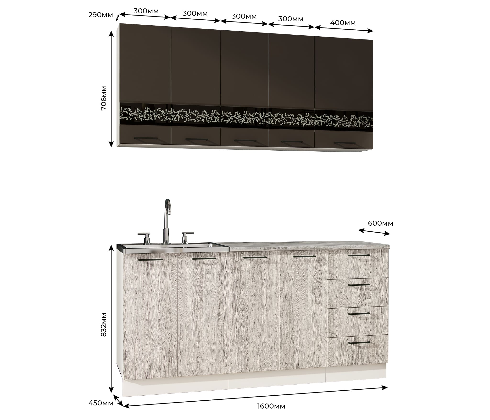 - Нижние корпуса: 600 мм под мойку – 1 шт. 600 мм с распашными фасадами – 1 шт. 400 мм с выдвижными ящиками – 1 шт. Высота 706 мм, глубина 450 мм. Материал ЛДСП.
