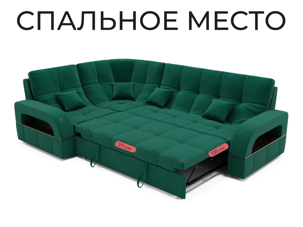 Спальное место имеет ширину 135 см и длину 211 см. Он предназначен для двух человек и имеет глубину сиденья 65 см. Максимальная нагрузка на диван составляет 280 кг.